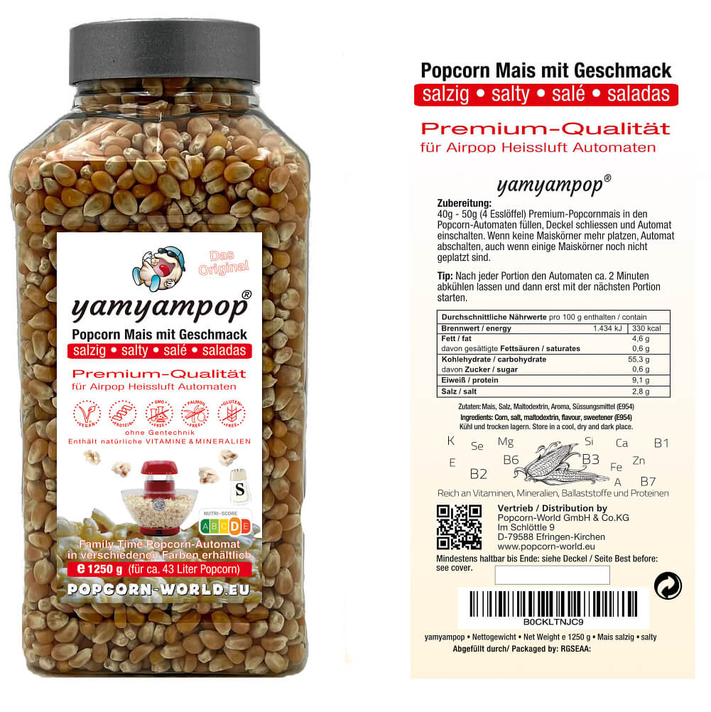 Fix und fertig mit Geschmack. Kein zusätzliches salzen nötig. Frei von Cholesterin, wenig Kalorien. Mais ist von Natur aus reich an B-Vitaminen und Ballaststoffen. Geeignet für alle Airpop-Automaten. Attraktiver, wiederverwendbarer PET-Behälter als hübsches Küchen-Accessoire.